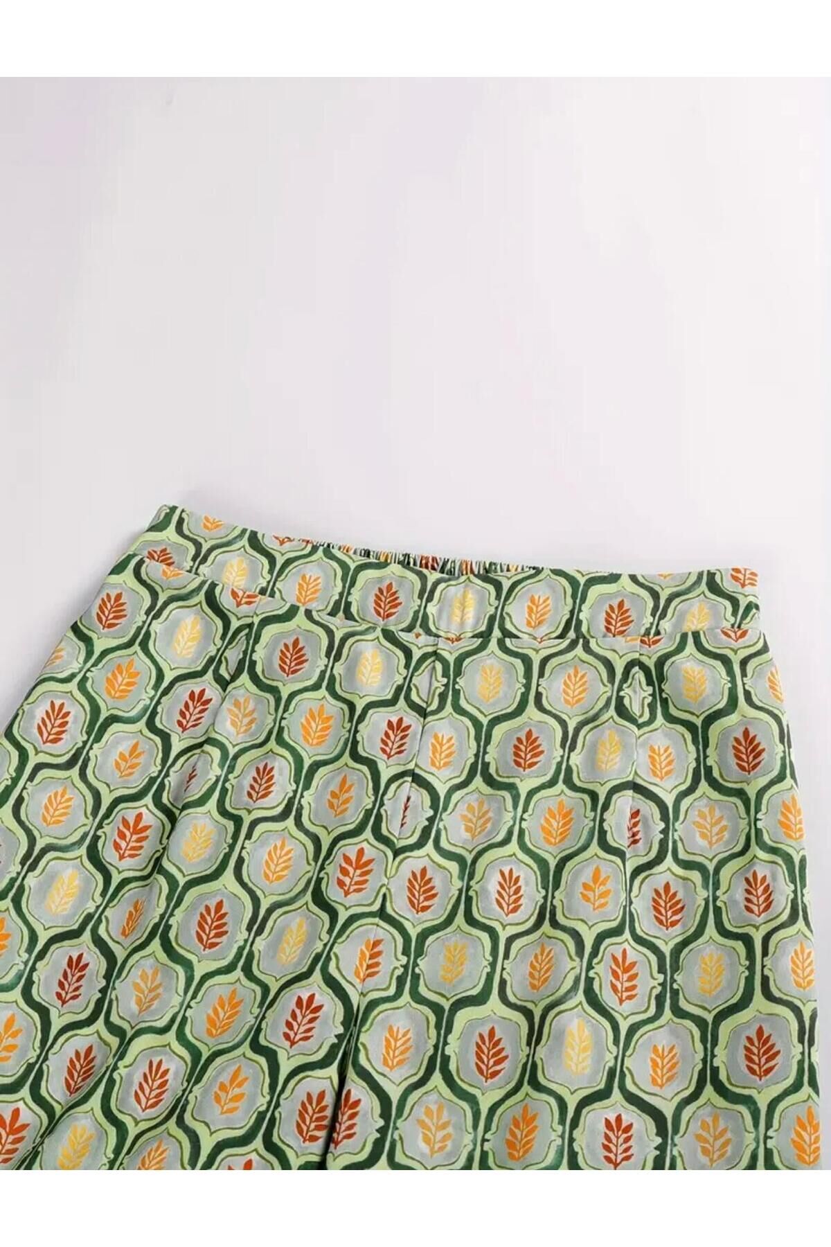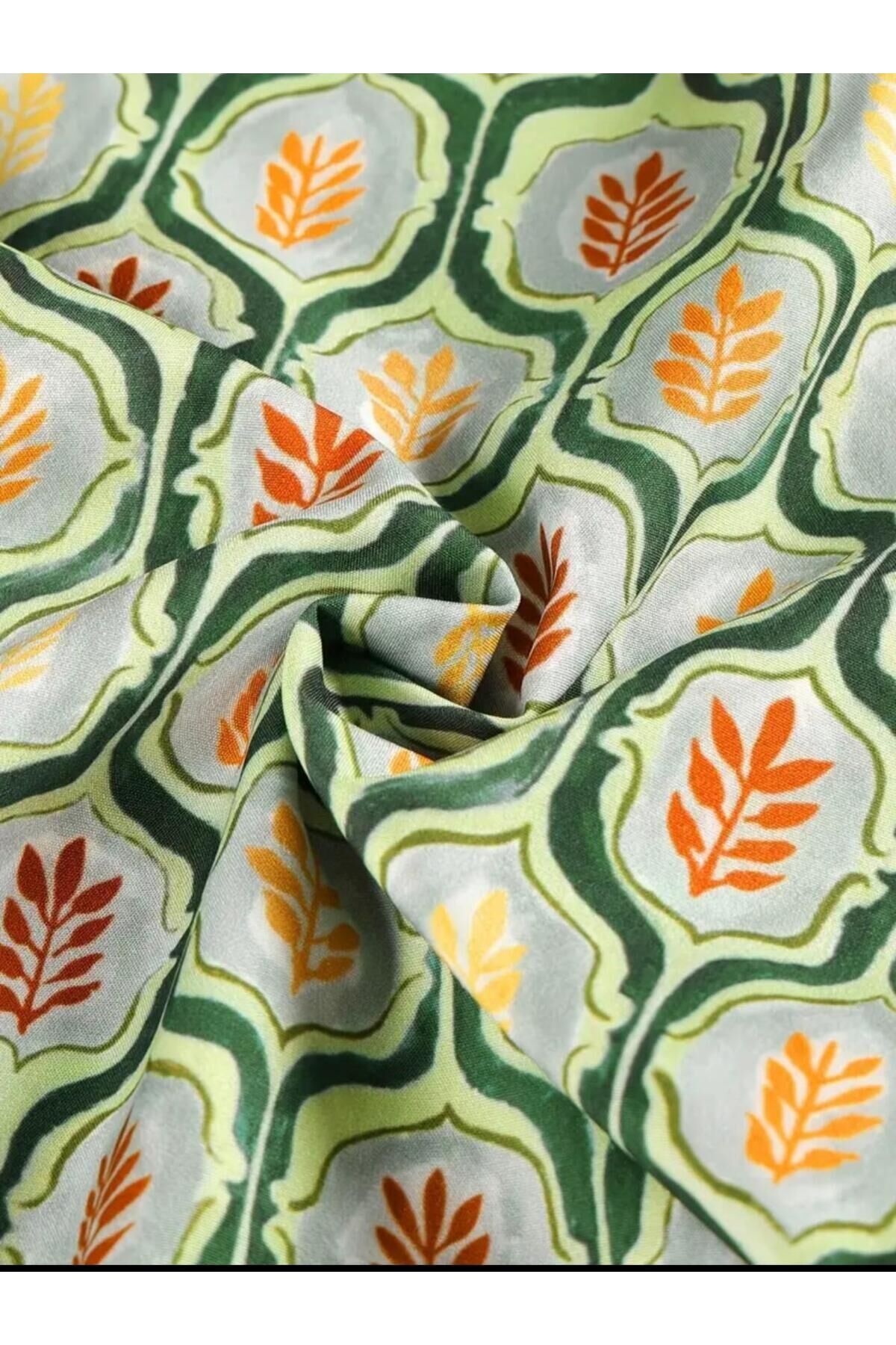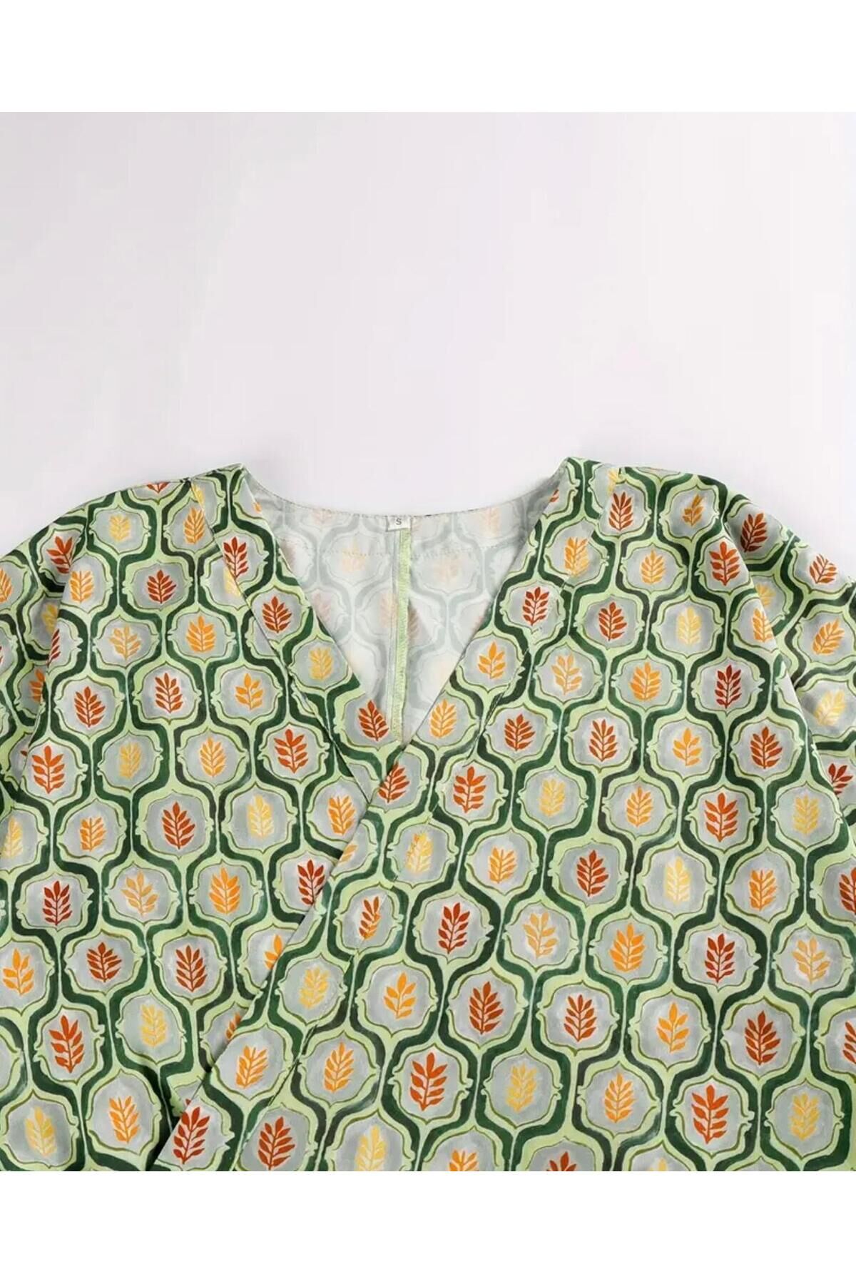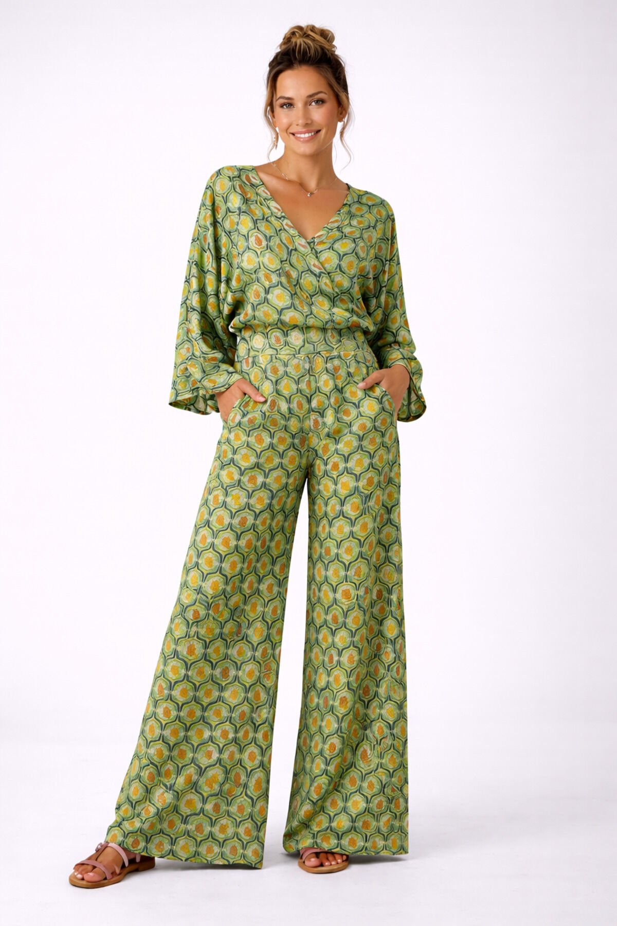 - Kruvaze yaka tasarımı ile modern ve şık bir görünüm sunar.; - Dijital baskı teknolojisi sayesinde canlı ve kalıcı renkler elde edilir.; - İki parçadan oluşan takım, hem rahatlık hem de stil arayanlar için idealdir.; - Geniş paça pantolon kesimiyle hareket özgürlüğü sağlar ve konforlu bir kullanım sunar.; - Chino cep detayları günlük kullanımda pratiklik kazandırırken, şıklığından ödün vermez.; - Astarsız yapısıyla hafif ve nefes alabilen bir yapıya sahiptir; sıcak günlerde bile serin tutar.; - Bağlama detayları ile farklı kombin seçenekleri yaratma imkanı tanır; kişisel zevke göre ayarlama yapılabilir.; - Beli lastikli tasarım sayesinde vücuda mükemmel uyum sağlar ve gün boyu rahat etmenizi garanti eder.; - Cool & comfort persona ile günlük hayatta rahatlıkla tercih edilebilir; her ortamda dikkat çeker.; - Tüm sezonlarda giyilebilen bu takım, mevsim geçişlerinde de idealdir.; - Etnik deseniyle özgün tarzınıza karakteristik dokunuşlar eklerken, trendleri takip eder.; - Türkiye'de üretilmiş olup yerel malzemelerle kalite standartlarına uygun şekilde hazırlanmıştır.; - Regular fit kalıbıyla vücudu sarmadan doğal duruşu korur; her bedene uygunluk gösterir.; - Orta kalınlığa sahip kumaşı mevsim koşullarına karşı dayanıklılık sunarken, konforundan ödün vermez.; - Casual koleksiyonun parçası olarak günlük giyimde rahatlıkla kullanılabilir; işlevsellikten uzaklaşmadan stil sahibi olmanızı sağlar.; - Lastikli bel detaylarıyla kolayca giyilip çıkartılabilir; zamandan tasarruf etmenize olanak tanır.; - Yetişkin yaş grubuna hitap eden geniş kullanıcı kitlesi düşünülerek tasarlanmıştır; geniş yaş aralığına uyumluluk gösterir.; - Uzun boy bluzu ve pantolonu ile zarif silueti tamamlar; bacak boyunu daha uzun gösterir.; - Düşük kol tipi sayesinde yaz aylarında serinlik hissi verirken, şık duruşundan vazgeçmez.; - Bluz-pantolon alt üst takım olarak kombinlenebilir; pratikliği ve estetiği bir arada sunar.; - Uzun kol boyu mevsimsel değişikliklere karşı koruma sağlarken, şık görünümünden ödün vermez.