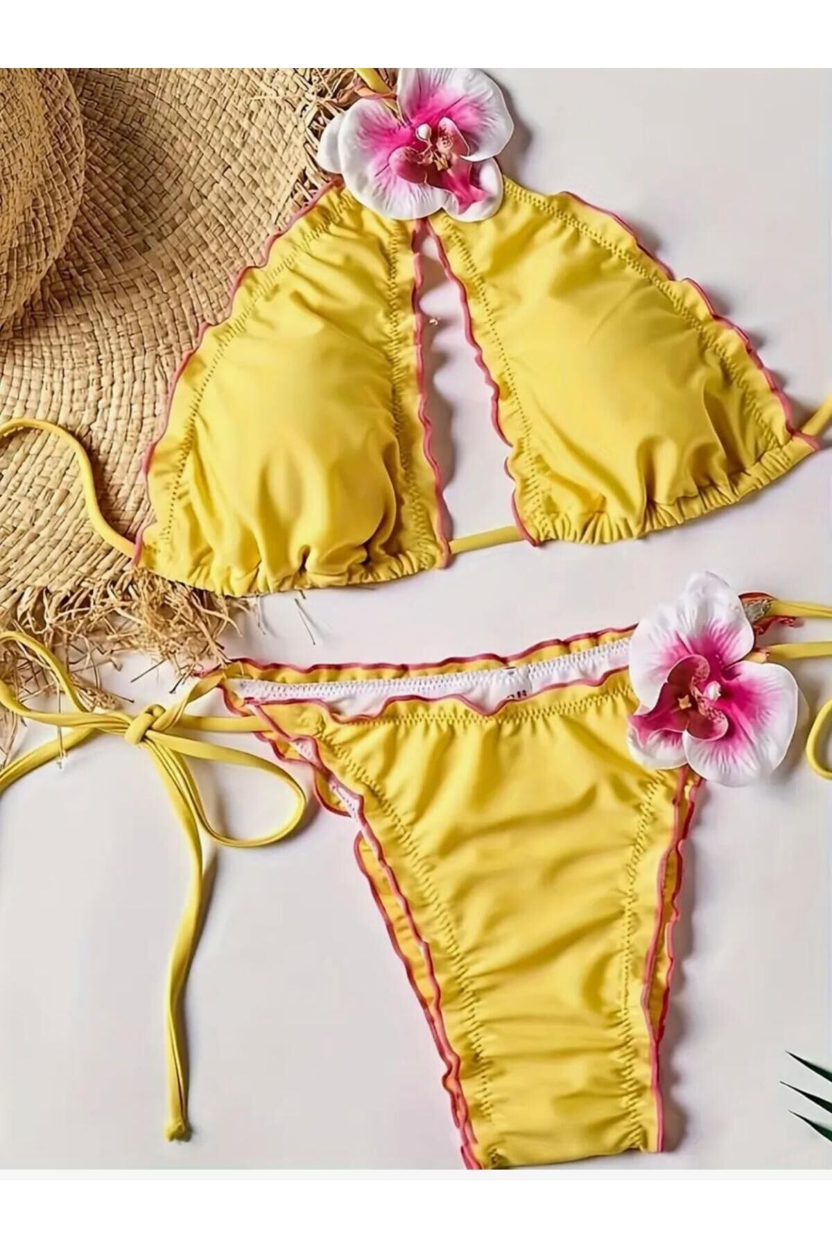 -38-40 Beden arası uyumludur.; -Hareket edebilir çiçek aksesuar detaylı - Yüksek kaliteli polyester materyalden üretilmiş, uzun ömürlü kullanım sunar.; - Slim silueti ile vücut hatlarınıza mükemmel uyum sağlayarak şık bir görünüm kazandırır.; - Fırfırlı detayları ile feminen ve zarif bir dokunuş ekler.; - Sexy tasarımıyla plajda dikkat çekici bir stil oluşturmanızı sağlar.; - Yaz sezonuna özel olarak tasarlanmıştır; sıcak havalarda konforlu bir deneyim sunar.; - İki parçadan oluşan set, hem üst hem de alt parça olarak tam bir bikini takımıdır.; - Plaj tekstil koleksiyonunun bir parçası olarak, beachwear ortamları için idealdir.; - Açık arka açıklığı sayesinde rahat hareket etme özgürlüğü tanır.; - Bağlama veya bağcık kapama şekliyle kişisel zevkinize göre ayarlanabilirlik sunar.; - Kadın ve kızlar için uygun tasarıma sahiptir; herkes tarafından rahatlıkla tercih edilebilir.; - Dokuma kumaş tipi dayanıklılığı arttırarak ürünün formunu korumasına yardımcı olur.; - Yetişkin yaş grubuna hitap eden bu bikini takımı ile plaj modasının trendlerini yakalarsınız.; - Türkiye menşeli olmasıyla yerel üretim avantajlarından faydalanırken kalite standartlarından ödün vermezsiniz.; - Brazilian alt silueti modern kesimiyle rahatlıkla giyilip çıkartılabilirken aynı zamanda şık görünmenizi sağlar.; - Düşük bel tasarımı sayesinde konforlu bir oturuşa sahip olmanız garanti edilir.; - Atma kap özelliği ile göğüs bölgesini destekleyerek doğal bir siluet oluşturur.; - Boyundan bağlamalı üst modeliyle omuzları serbest bırakarak bronzlaşmayı kolaylaştırır.; - Üçgen üst kesimi hem estetik hem de pratik kullanım imkanı sunar; güneşten korunurken rahatça hareket edebilirsiniz.; - Üstteki üçgen siluet modern çizgilere sahiptir; her türden vücut tipine uyum sağlayabilir.; - Altta yer alan Brazilian silueti minimalist tasarım anlayışını benimseyenler için idealdir; minimal detaylarla zarafeti ön plana çıkarır.; - Düz deseniyle sadelikten yana olanların tercihi olurken kombin yapmayı da zahmetsizleştirir.; - Ekstra özellik bulunmayan bu bikini takımı temel ihtiyaçları karşılar; sadeliğiyle ön plana çıkarken aynı zamanda şıklığından ödün vermez.; - Üstteki üçgen üst silueti ile modern çizgilere sahipken altta yer alan Brazilian alt silueti minimal detaylarla zarafeti ön plana çıkarır.
