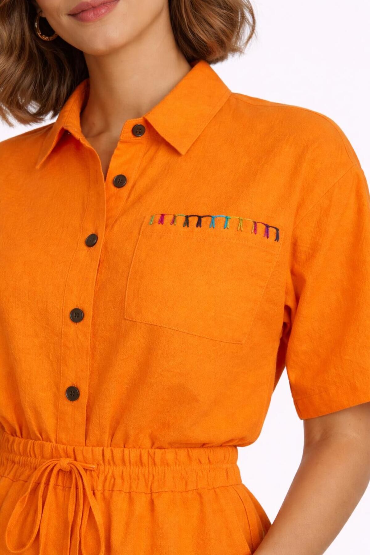 - Zarif sargı nakış detaylarıyla süslenmiş, trend bir görünüm sunar.; - Çift cepli tasarımı ile hem şık hem de fonksiyonel bir kullanım sağlar.; - Bağcıklı kemer detayı sayesinde belinizi istediğiniz gibi ayarlayabilirsiniz.; - İlkbahar ve sonbahar mevsimleri için ideal, ince yapısıyla hafif ve rahat bir kullanım sunar.; - Full düğme kapama özelliği ile kolay giyilip çıkartılabilir ve şık bir görünüm kazandırır.; - Pamuk ve polyester karışımı kumaşı sayesinde dayanıklı ve konforlu bir deneyim yaşatır.; - Geniş paça tasarımı, modern ve rahat bir siluet oluşturur.; - Polo yaka detayı ile klasik ve zamansız bir stil sunar.; - İki parçadan oluşan takım, kombin yapmayı kolaylaştırır.; - Astarsız yapısıyla hafif ve serin tutar.; - Lastikli bel tasarımı sayesinde rahat bir oturuş sağlar.; - Kısa boy kesimiyle dinamik ve genç bir görünüm kazandırır.; - Dokuma kumaş tipi, dayanıklılığı ve şık görünümü bir arada sunar.; - Yetişkin kadınlar için uygun regular kalıp, her vücut tipine uyum sağlar.; - Düz deseniyle sade ve şık bir tarz yaratır.; - Türkiye'de üretilmiş olup, yerel işçiliği destekler.;