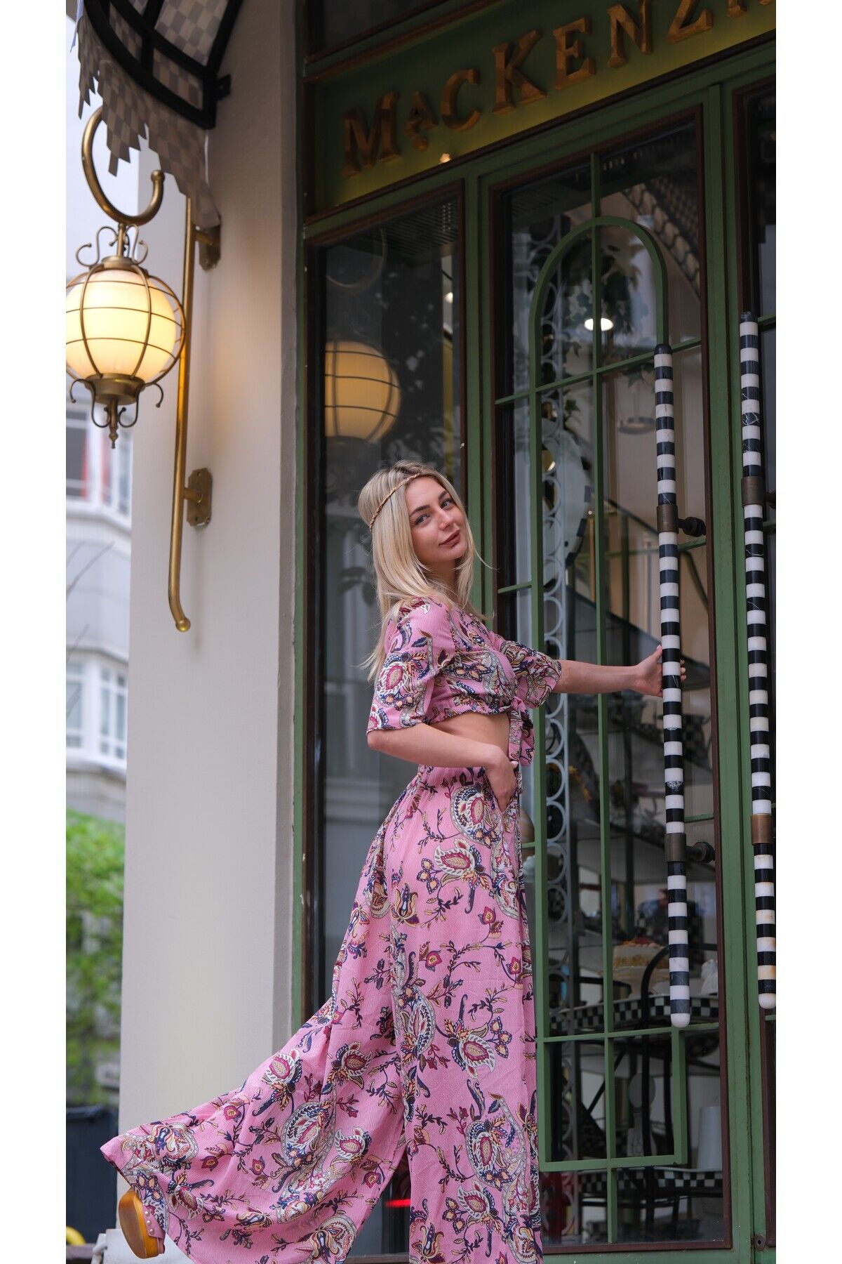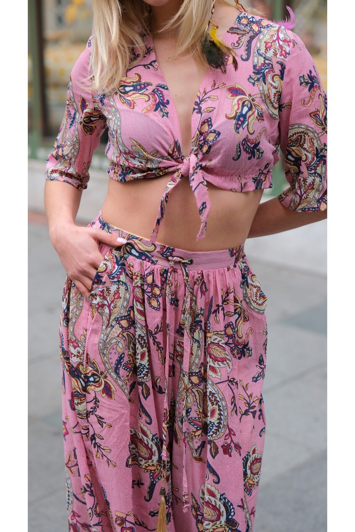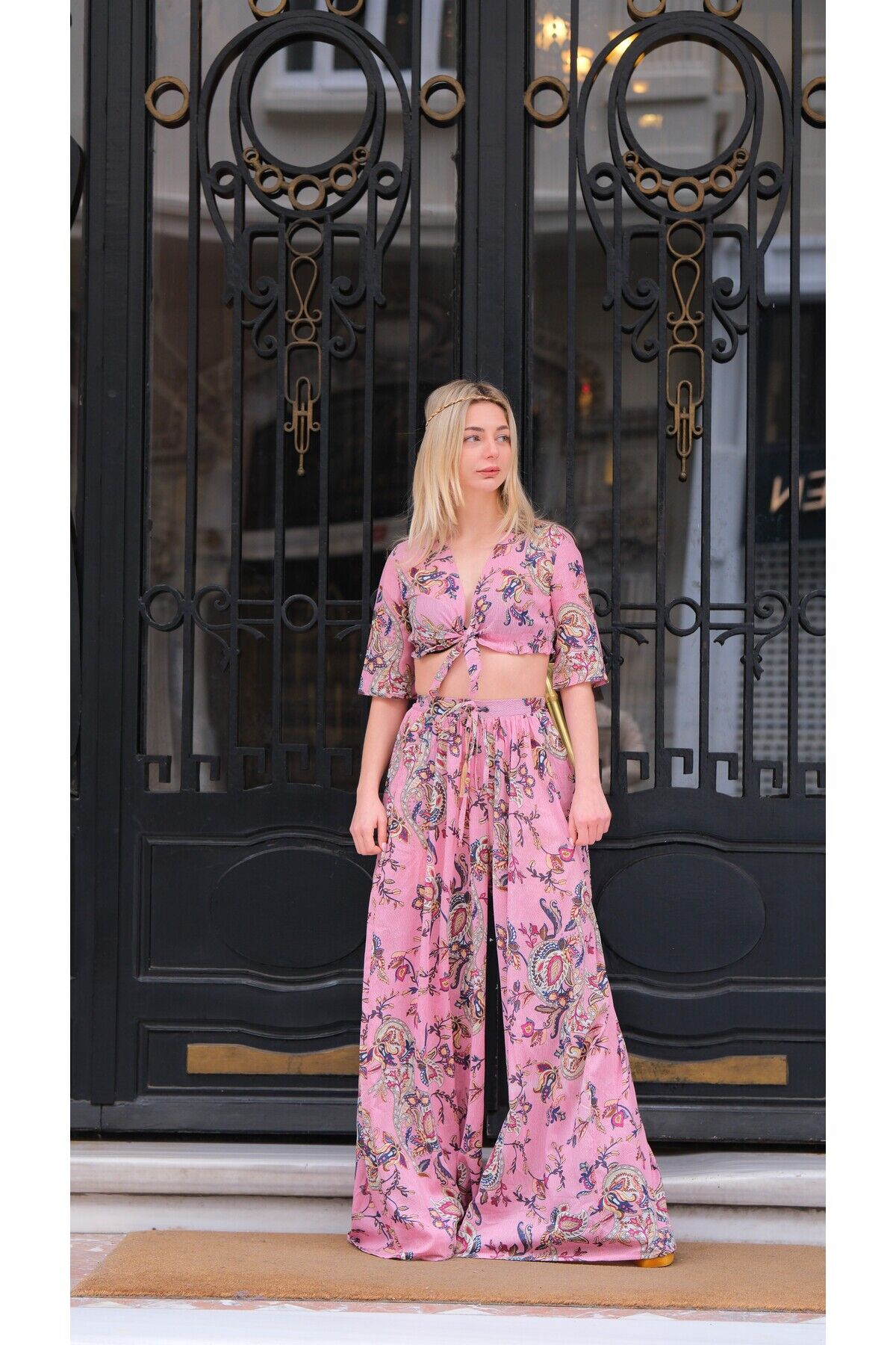 - Geniş paça tasarımı ile rahat hareket etme özgürlüğü sunar.; - Yaz sezonuna uygun hafif kumaşı, sıcak günlerde serinlik sağlar.; - Çift cepli yapısı küçük eşyalarınız için pratik saklama alanları sunar.; - Bağlama veya bağcık detayı sayesinde kolayca ayarlama imkanı tanır.; - Astarsız olmasıyla hafif ve nefes alabilen bir kullanım vaat eder.; - Dokuma kumaş tipi dayanıklılığı artırırken şık görünümü korur.; - Etnik deseniyle bohem tarzınıza özgün bir dokunuş ekler.; - Kadın / kız cinsiyetine hitap eden tasarımıyla herkes için idealdir.; - Yetişkin yaş grubuna uygun olarak üretilmiştir; zamansız parçalar arasında yerini alır.; - Uzun boy kesimi ile bacakları olduğundan daha uzun gösterirken şıklığından ödün vermez.; - Menşe yeri Türkiye'dir; yerel üretim avantajını yansıtırken kalite standartlarından ödün vermez.; - Regular kalıp sayesinde vücut hatlarınıza uyum sağlar ancak sıkıştırmaz.; - Kısa kol boyu yaz aylarında serbestlik sunarken standart kol tipiyle konforlu kullanım sağlar.; - Pamuklu materyali cildinizle dosttur ve yumuşak dokusuyla gün boyu rahatlık sunar.; - Bluz-pantolon ikilisi olarak tasarlanmıştır; kombin yapmayı kolaylaştırır ve şık görünümünüz tamamlanır.; -Trend ortamlarda dahi stil sahibi olmanız için idealdir; güncel moda akımlarıyla uyumlu detaylara sahiptir.