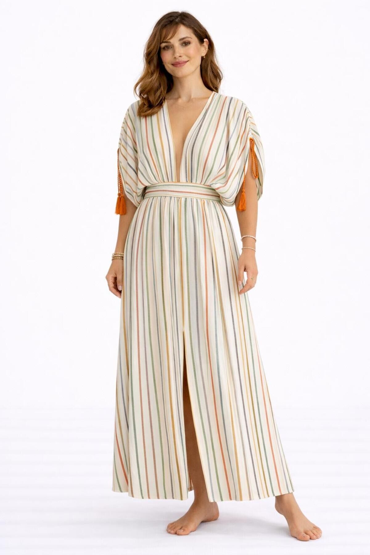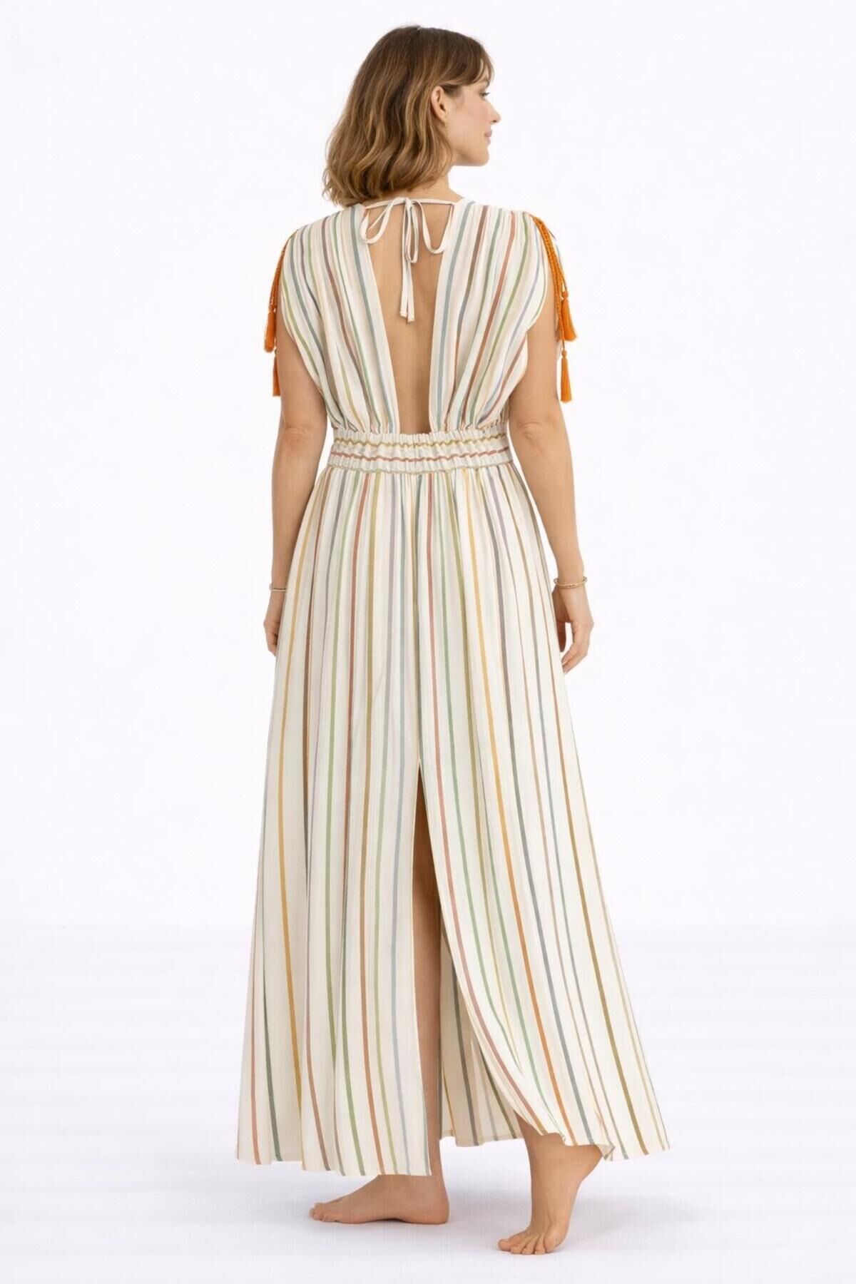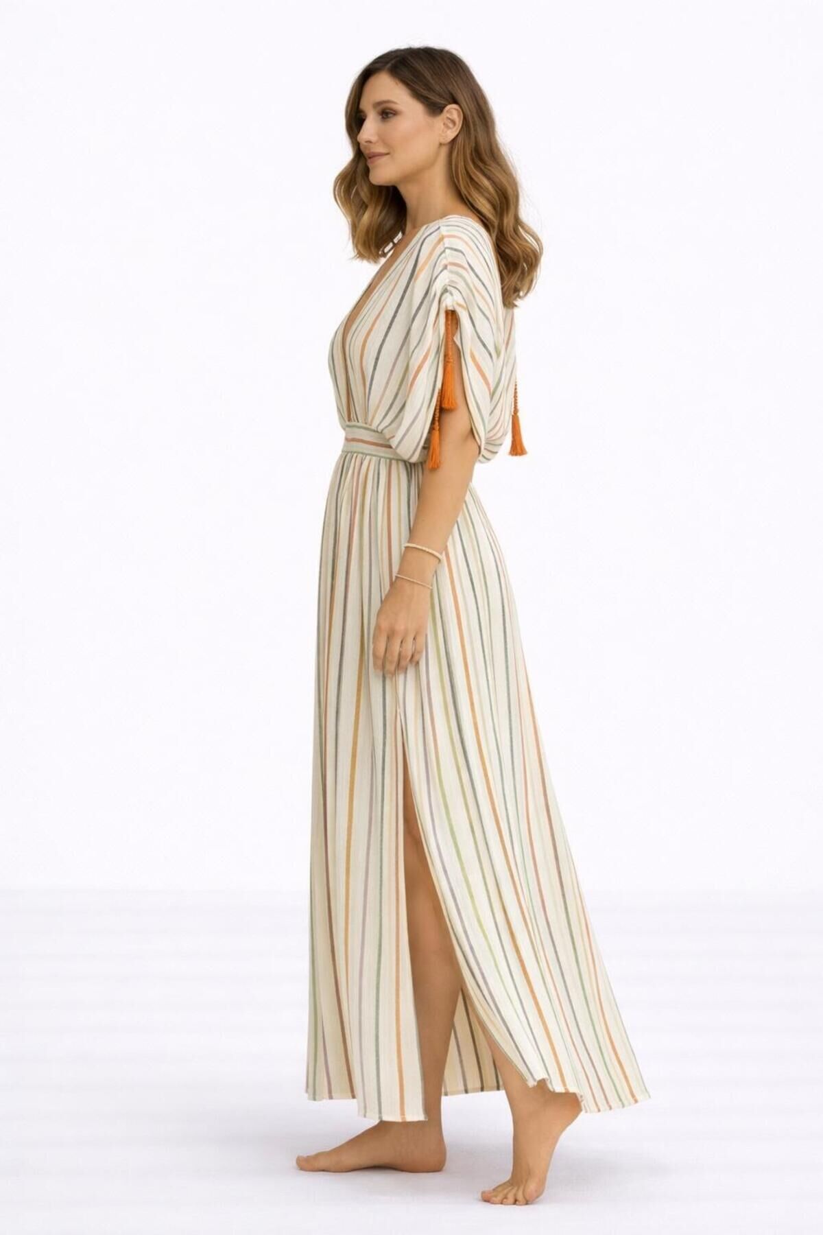 - Rahat ve şık bir görünüm için ideal, keten karışımlı kumaştan üretilmiştir.; - Düşük kollu tasarımı ile yaz aylarında serinlik ve konfor sunar.; - Çizgili deseniyle zamansız bir stil yaratır.; - V yaka detayı ile feminen bir hava katar.; - Kısa kollu yapısı, hareket özgürlüğü sağlar.; - Püskül detayları ile modern ve dinamik bir dokunuş ekler.; - İnce yapısıyla hafif ve nefes alabilen bir kullanım sunar.; - Trend ortamlarda dikkat çekici bir görünüm sağlar.; - Beli lastikli tasarımı sayesinde rahat bir oturuş ve kolay giyim imkanı sunar.; - Regular siluetiyle vücut hatlarını saran ancak sıkmayan bir yapıya sahiptir.; - Astarsız yapısıyla yaz aylarında ekstra konfor sağlar.; - Kemerli tasarımı belinizi vurgulayarak şık bir görünüm kazandırır.; - Tüm sezonlar için uygun, mevsim geçişlerinde de tercih edilebilir.; - Yetişkin kadınların gardırobunda yerini alacak şık ve rahat bir elbise.; - Türkiye'de üretilmiş olup, yerel üretim kalitesini yansıtır.; - Normal boy kesimiyle farklı vücut tiplerine uyum sağlar.; - Kapamasız ve kapsız yapısıyla pratik kullanım sunar.;