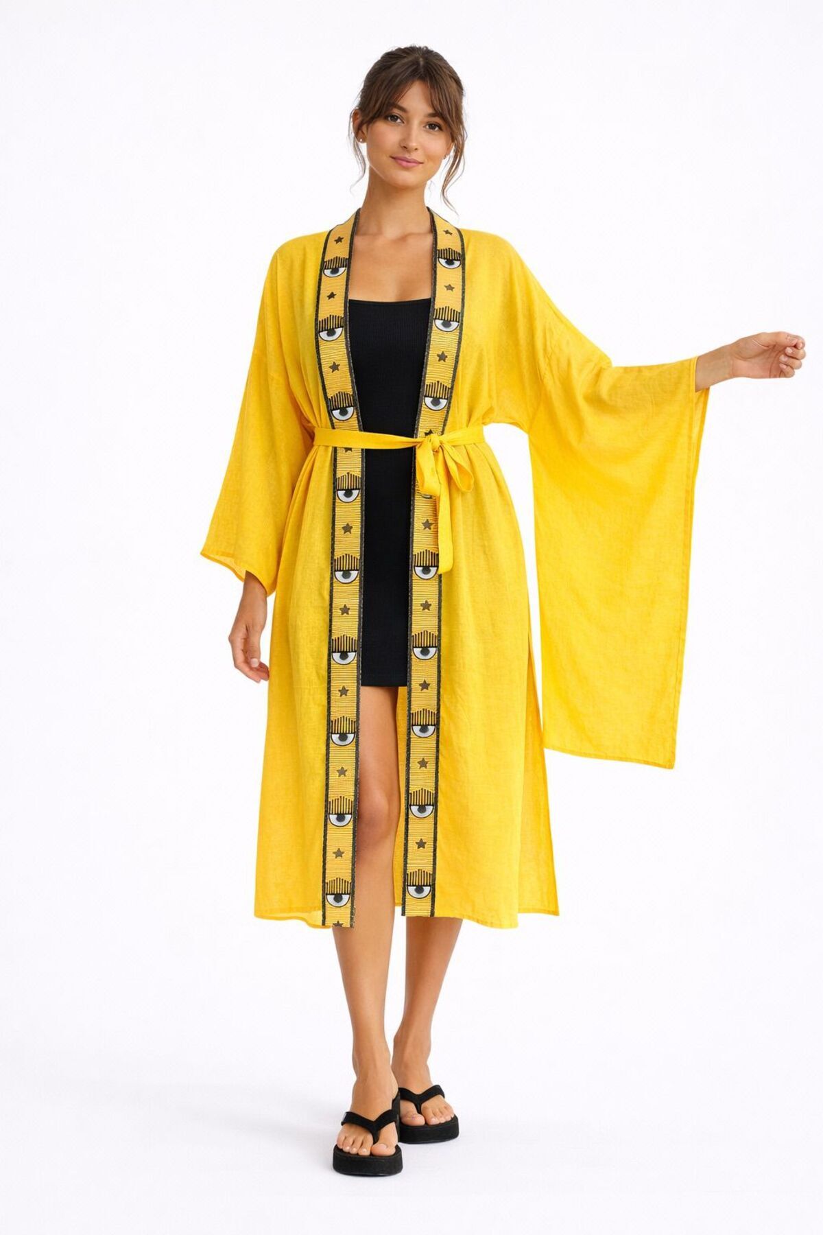 - Mendil kol tasarımı ile feminen bir siluet sunar.; - Aplike detayları, sade düz desenle modern bir dokunuş katıyor.; - Kuşak detayı sayesinde belinizi vurgulayarak zarif bir görünüm sağlar.; - Tüm sezonlarda rahatlıkla tercih edebileceğiniz çok yönlü bir parça.; - Relaxed kalıbı ile gün boyu konforlu bir kullanım sunar.; - Bağlama/bağcık kapama şekli, kişisel zevkinize göre ayarlama imkanı verir.; - Yırtmaç detayları hareket özgürlüğü sağlarken şıklığınızı artırır.; - Uzun kolları ile mevsim geçişlerinde ideal koruma sunar.; - %100 pamuk materyali cildinize nefes aldırır ve gün boyu rahatlık sağlar.; -Mendil kumşa özelliği ile üzerinizde yok hissi uyandırır.; - Plaj tekstil koleksiyonunun trend parçası olarak dikkat çeker.; - Kruvaze yaka tipi ile sofistike bir hava katar.; - Yetişkin kadınlar için tasarlanmış, şık ve rahat bir tercih.; - Dokuma kumaş tipi dayanıklılığı artırırken, midi boyu zarif bir duruş sağlar.; - Kadın/kız kullanıcılar için uygun, her gardıropta olması gereken temel bir parça.;