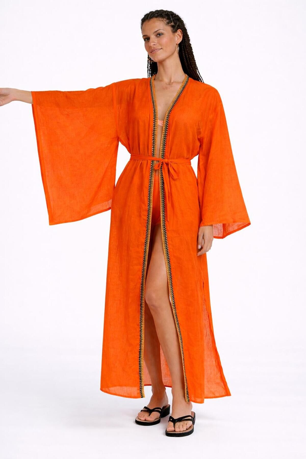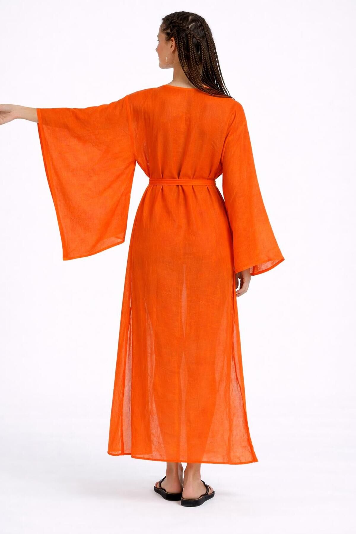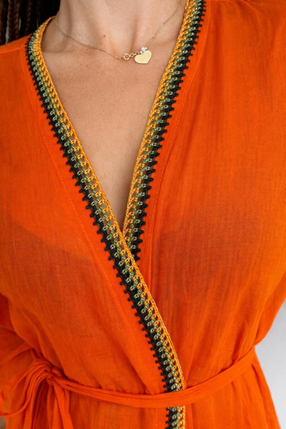 -yakadan etek ucuna kadar uzanan Handmade tığ işi uygulaması - Mendil kol tasarımı ile feminen bir siluet sunar.; - Yırtmaç detayları hareket özgürlüğü sağlar ve şıklığı artırır.; - Düz deseniyle kolayca kombinlenebilir ve zamansız bir görünüm kazandırır.; - Kuşak detayı belinizi vurgulayarak feminen bir duruş sergiler.; - Tüm sezonlarda rahatlıkla tercih edilebilen çok yönlü bir üründür.; - Relaxed kalıbı sayesinde gün boyu konforlu bir kullanım sunar.; - Bağlama / bağcık kapama şekliyle kişisel uyumu kolayca ayarlayabilirsiniz.; - Uzun kollu tasarımı, mevsim geçişlerinde ideal koruma sağlar.; - Pamuklu materyali cildinizle dosttur ve nefes alabilir yapısıyla rahatlık sunar.; - Plaj tekstil koleksiyonunun parçası olarak yaz aylarının vazgeçilmezi olacak.; - Trend ortamlarda stilinizi yansıtacak modern bir seçenektir.; - Kruvaze yaka tipiyle sofistike bir hava katar.; - Yetişkin kadınlar ve kızlar için uygun geniş yaş aralığına hitap eder.; - Dokuma kumaş tipi dayanıklılığı ve şık görünümü bir arada sunar.; - Uzun boyu ile zarif bir siluet oluştururken, rahat hareket etme imkanı verir.; - Türkiye'de üretilmiş olup yerel üretimden yana tercih yapmanızı sağlar.;