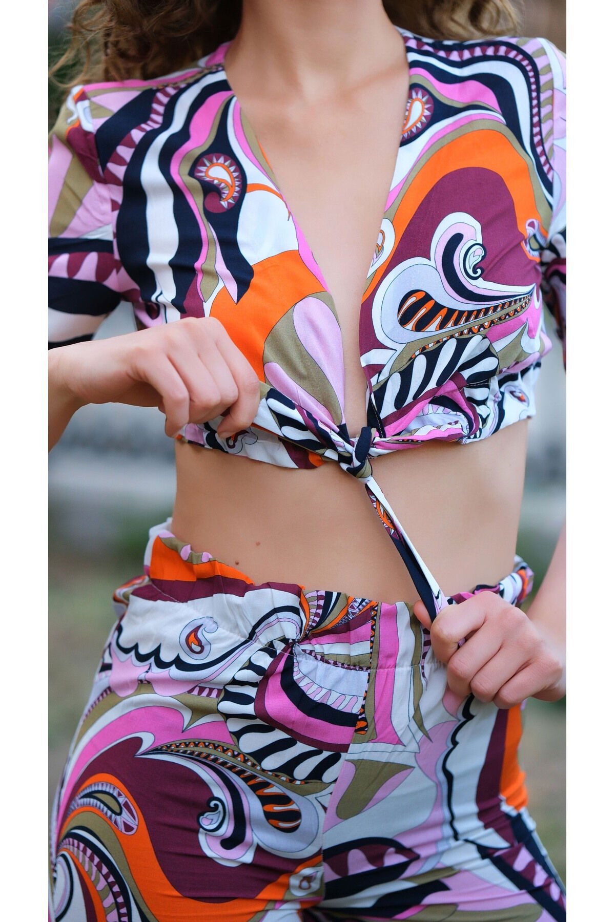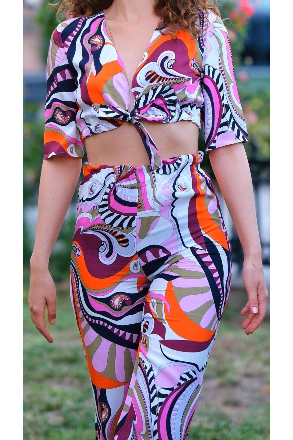- Göğüs kısmından bağlama özelliği sayesinde kolayca ayarlanabilir ve kişisel zevke göre şekillendirilebilir.; - İnce yapısıyla yaz aylarında serinlik ve rahatlık sunar.; - Cool & Comfort persona'sı ile günlük kullanımda şıklığı ve konforu bir arada yaşatır.; - Design koleksiyonunun özgün tasarımları arasında yer alan bu takım, trendleri takip edenler için idealdir.; - Kruvaze yaka tipi ile modern ve sofistike bir görünüm kazandırır.; - Bağlama veya bağcık detayı sayesinde pratik kullanım imkanı sağlar; gerektiğinde hızlıca açılıp kapanabilir.; - Lastikli bel kısmı ile vücudu saran ancak sıkmayan bir oturuş sunar.; - İki parçadan oluşan set, bluz-pantolon kombinasyonuyla bütünsel bir stil oluşturur.; - Slim silueti sayesinde zarif ve feminen bir duruş sergiler.; - Yaz sezonuna özel olarak tasarlanmıştır; hafif kumaşıyla sıcak günlerde bile ferahlık hissi verir.; - Boru paça kesimi modern çizgilerle retro esintileri harmanlar.; - Astarsız oluşuyla hafifliği ön plana çıkartırken, şık görünümünden ödün vermez.; - Cepsiz yapısıyla minimalist tasarım anlayışını benimserken fonksiyonelliği de ihmal etmez.; - Kemersiz olması sayesinde daha minimal ve sade bir tarz yaratırken, herhangi bir aksesuarla kolayca tamamlanabilir.; - Düz dokuma kumaşı dayanıklılığı arttırarak uzun süreli kullanım vaad eder.; - Beli lastikli tasarım rahat hareket etme özgürlüğü tanırken aynı zamanda şık bir detay olarak da ön plana çıkıyor.; - Şal deseniyle göz alıcı desen seçenekleri arasından seçim yapabilme imkanı sağlar; her ortamda fark edilmeye değer bir stil sunar.; -Regular kalıp sayesinde her bedene uygun rahatlıkta bir giyim deneyimi yaşatır.; -Kadın ve kız kullanıcılar için özel olarak tasarlanmıştır; her yaştan kadının gardırobunda yerini alacak şekilde düşünülmüştür.; -Dokuma kumaşı kaliteli hissiyat verirken dayanıklılık açısından da üst düzey performans gösterir.; -Uzun boyu sayesinde bacakları olduğundan daha uzun gösterir ve zarif bir siluet çizer.; -TR menşeli olması yerel üretimden gelen kaliteyi yansıtırken, Trend ortamına uygun güncel moda akımlarına da hitap eder.; -Yetişkinlerin günlük yaşamında ihtiyaç duyduğu rahatlık ve şıklığı bir arada sunan bu takım, gardrobun vazgeçilmez parçalarından biri haline gelir.; -Standart kol tipi ile klasikleşmiş modellerden ilham alarak modern çizgilere sahip olur; truvakar kol detayı ise hareket serbestliği sağlar.