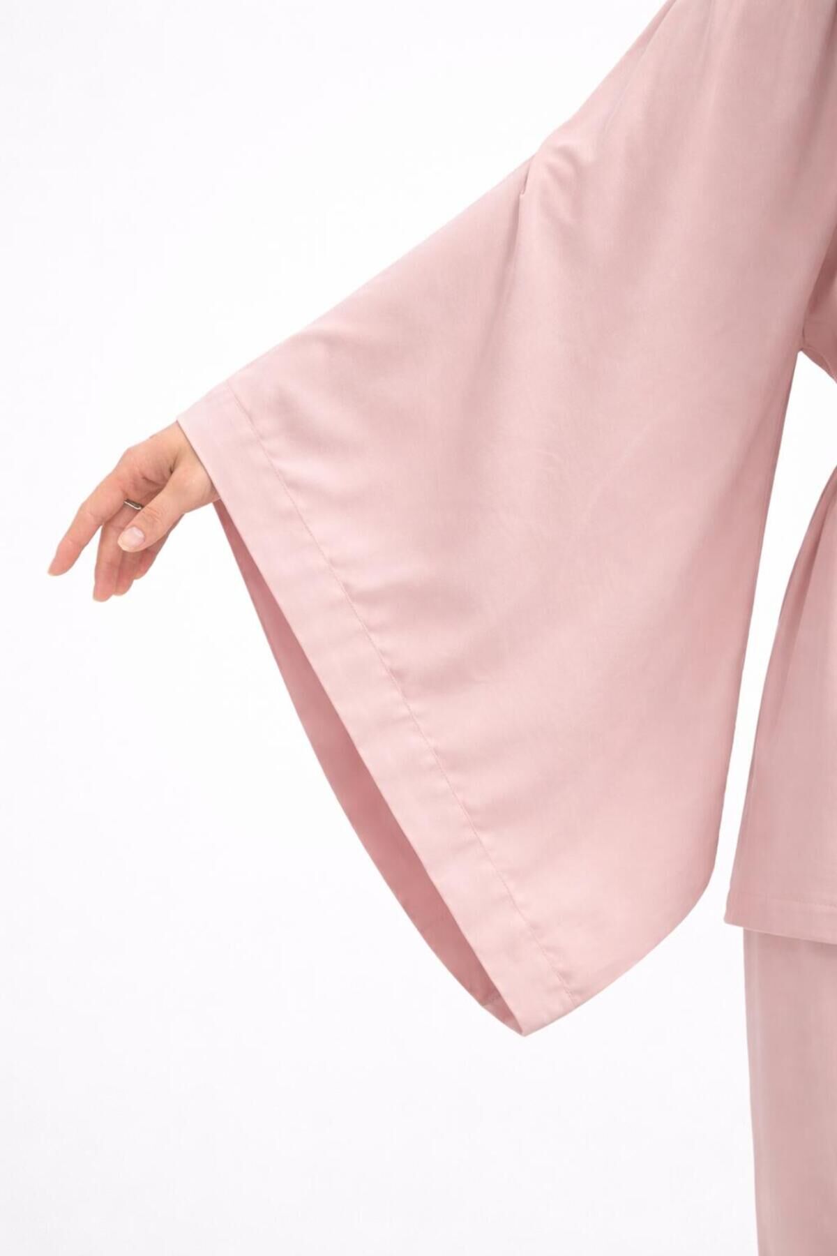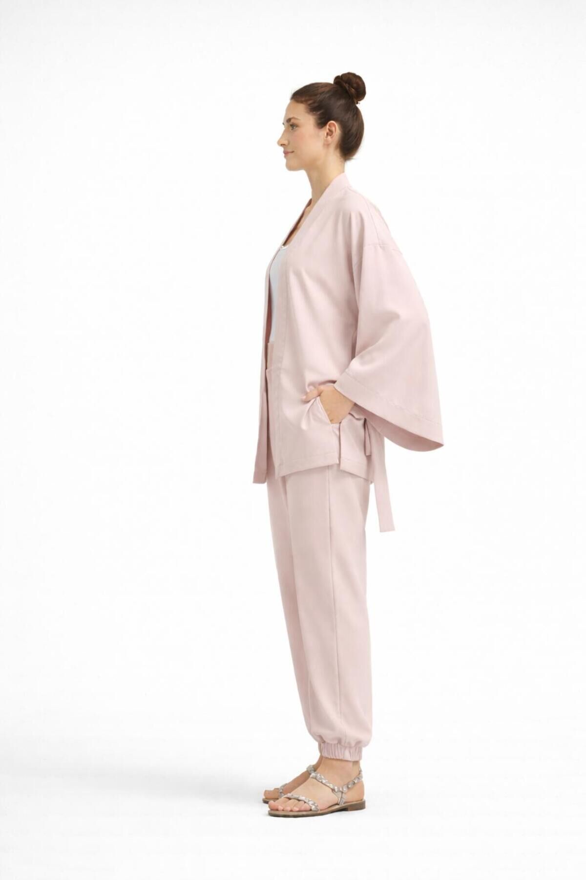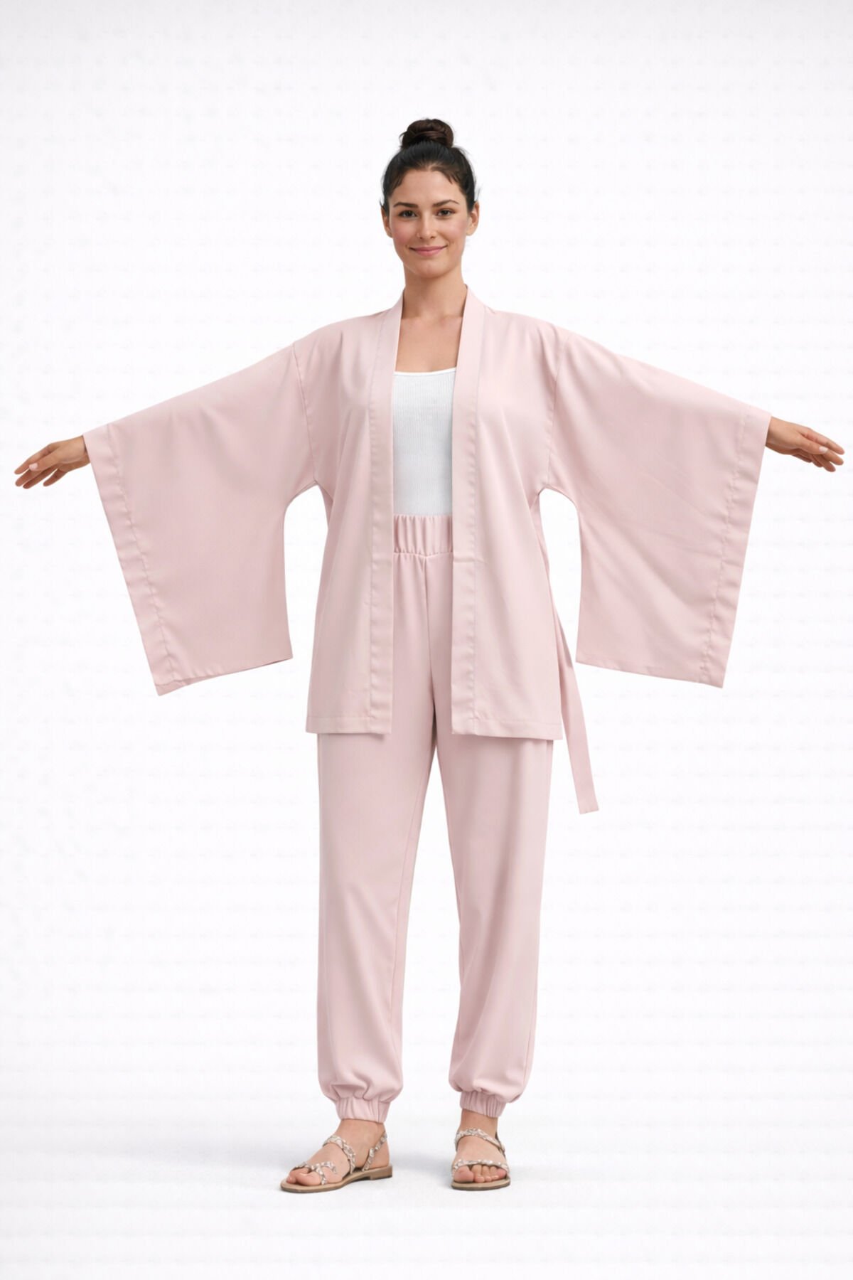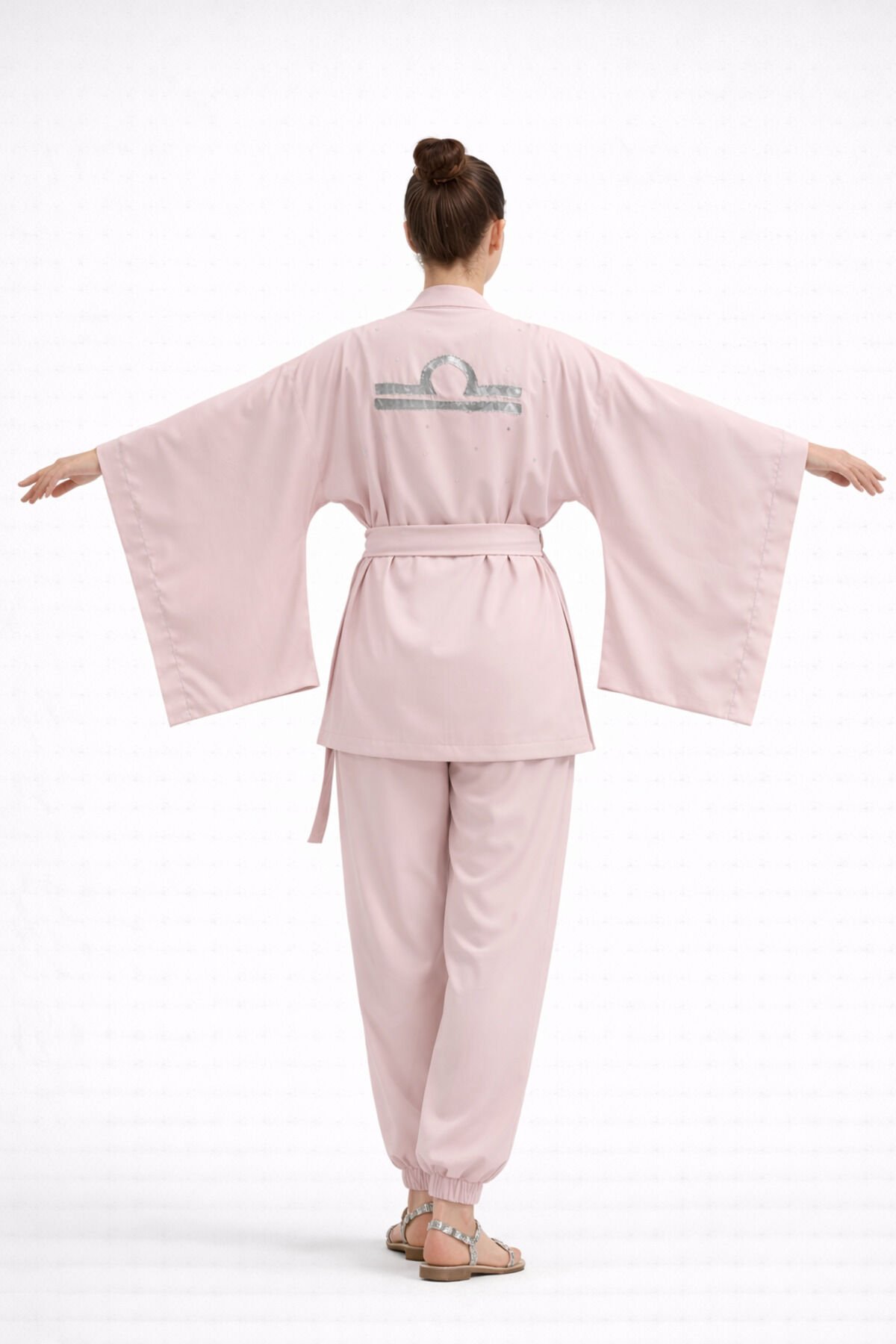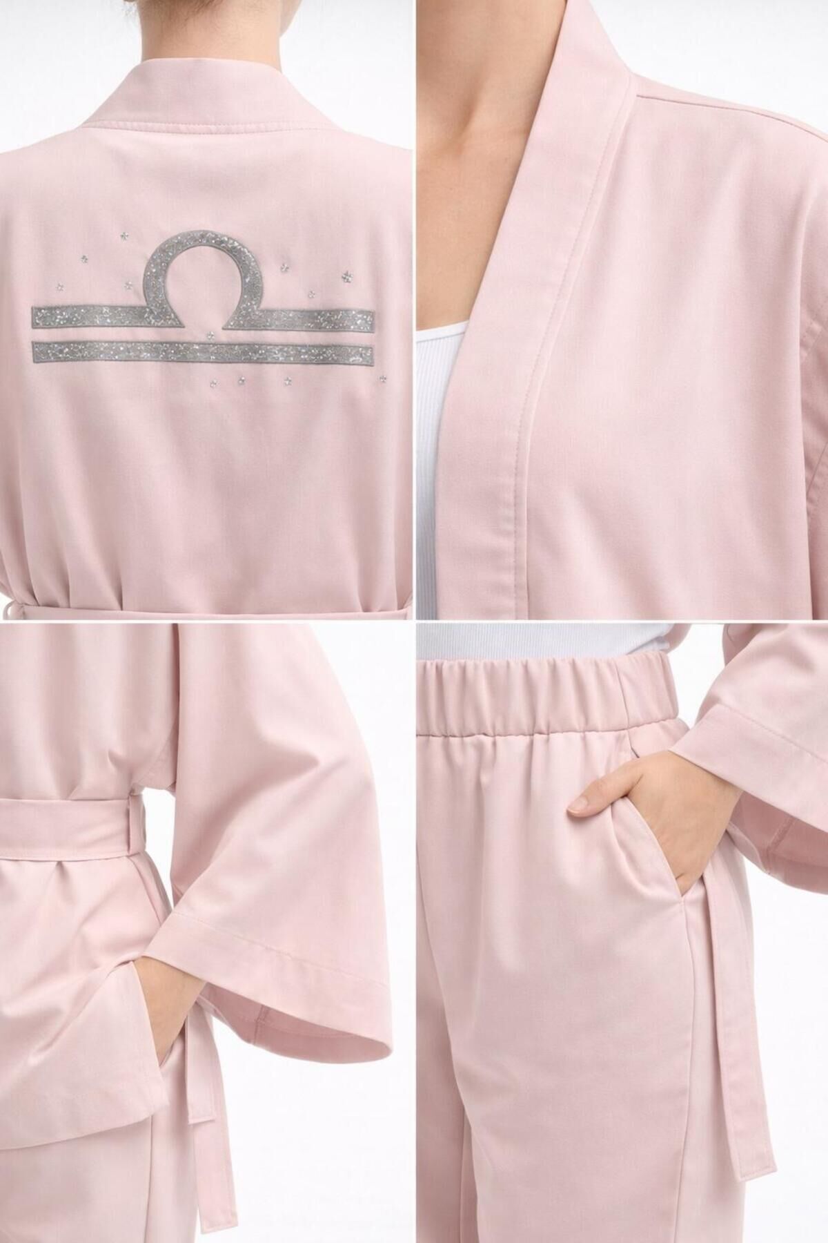 36,38,40 Beden arası uyumludur.; -Kırışmayan kumaş özelliğine sahiptir - Terleme yapmaz.; - Zarif nakış detaylarıyla süslenmiş, Terazi burcu tasarımına sahip bu kimononun cep detayları pratik kullanım sunar.; - Kruvaze kapama şekli ile modern ve şık bir görünüm elde edilirken, V yaka tasarımı feminen çizgileri ön plana çıkarır.; - Uzun kol boyu sayesinde mevsim koşullarına uygun konfor sağlar; kısa veya mini boy seçenekleriyle farklı kombinler oluşturmanız mümkündür.; - Günlük kullanım için ideal olan bu takım, hem gündüz hem de gece ortamları için uygundur.; - Vual dokuma tipi hafifliği ve nefes alabilir yapısıyla gün boyu rahatlık sunarken, düşük kol tasarımı hareket özgürlüğü sağlar.; - Pamuklu materyali cildinizle dosttur ve uzun süreli kullanımlarda bile formunu korur.; - Desenli nakış işlemeleriyle göz alıcı bir stil yaratırken, kuşak detayı bel bölgesini vurgulayarak zarif bir siluet oluşturur.; - Design koleksiyonuna ait bu parça, her gardıropta bulunması gereken zamansız parçalardan biridir.